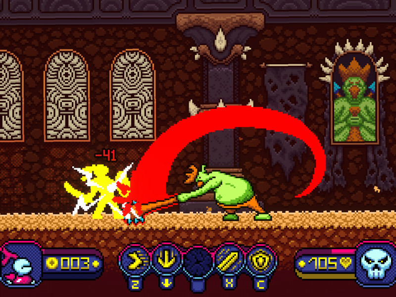 Développé par Eastasiasoft Limited , Tiny Pixels Vol. 2 – Stormy Knights est un titre très minimaliste, centré exclusivement sur le gameplay, lui-même largement cyclique et répétitif. Ce principe exclut donc toute forme de narration. Il n'y a ni histoire ni univers ; la seule chose que nous connaissons, c'est notre objectif : sauver des princesses kidnappées. Le jeu nous met dans la peau d'un chevalier petit, courageux et résolument anonyme , qui se lance dans un voyage linéaire (non procédural) à travers une série de lieux classiques, affrontant des ennemis tout aussi prévisibles. Ces ennemis constituent notre principal et unique obstacle pour atteindre et libérer la demoiselle en question… dans le plus classique des classiques, où un chevalier sauve une dame kidnappée. Notons quelques remarques sur le style graphique qui, bien que banal, est en accord avec le titre de la collection, « Tiny Pixel », et plus encore avec sa philosophie : moins, c'est plus. Comme nous le découvrirons, le gameplay de Stormy Knights n'est pas particulièrement techniquement abouti, mais il possède un système capable de captiver et de captiver le joueur d'une partie à l'autre. Tiny Pixels Vol. 2 – Stormy Knights propose une série de combats 2D à défilement latéral, en un contre un . Cela se traduit par des combats plus lents et plus réfléchis, où les personnages sont notamment ancrés au sol. Il n'y a pas de sauts, mais vous avez la capacité essentielle de reculer rapidement, de vous baisser ou d'utiliser votre bouclier pour parer et/ou renvoyer certaines attaques. L'arsenal de notre petit chevalier comprend également une épée classique à moyenne portée et un sort de foudre à débloquer et à maîtriser. En tant que jeu d'action, Tiny Pixels Vol. 2 – Stormy Knights s'apparente à une structure à la Souls, avec des affrontements exigeant une réflexion approfondie, même contre les serviteurs les plus anonymes et les plus fragiles.
