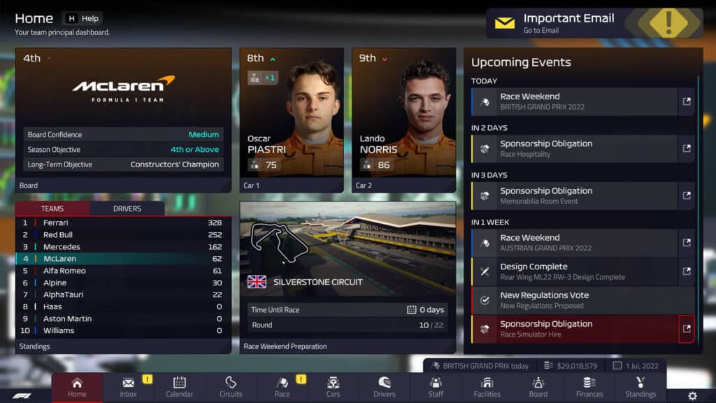 ![]() Plate-forme : PlayStation 5 - PC - PlayStation 4 - Xbox One - Xbox Series X Date de sortie : 30 Août 2022 Editeur : Développeur : Genre : Stratégie Multijoueur : Non Jouable via Internet : Non Test par Nic0077.5/10 Dirigez le destin d'une écurie de Formule 1 en tant que chef d'équipe et remportez le championnat. Une entrée en matière cohérente.La Formule 1 est l'une des licences les plus puissantes du secteur sportif. Dernièrement, Codemasters vous a donné l'occasion de prendre le volant d'une F1 dans "F1 22" et de courir pour la victoire avec Lewis Hamilton et compagnie. Mais dans "F1 Manager 2022" de Frontier Development, vous tirez les ficelles dans l'ombre et, en tant que chef d'équipe, vous vous occupez des finances, du développement et même de la stratégie de votre écurie. Cela ressemble au rêve devenu réalité de tous les fans de Formule 1 - mais "F1 Manager 2022" est-il aussi bon que beaucoup l'espèrent ? Dans "F1 Manager 2022", vous prenez le contrôle d'une des dix écuries du circuit de Formule 1 en tant que chef d'équipe. Contrairement à "F1 2022", il n'est malheureusement pas possible de créer sa propre entreprise. Le choix de votre équipe détermine les conditions de départ. Chez Ferrari, par exemple, vous disposez d'un solide matelas financier, mais le conseil d'administration attend aussi que vous finissiez dans le top 3 du classement des constructeurs et des pilotes à la fin de la saison. En tant que simulation économique et sportive, "F1 Manager 2022" vous assomme dès les premières minutes avec des tâches, des tableaux et des termes techniques. Pour les débutants, le jeu propose heureusement un assistant qui les guidera durant les premières semaines en tant que chef d'équipe et leur expliquera ou les déchargera de nombreuses tâches. Frontier Developments s'efforce de rendre le jeu clair et compréhensible malgré sa complexité. Point fort : le week-end de course.Le point fort du jeu est sans aucun doute les week-ends de Grand Prix : Ceux-ci commencent en principe par la préparation et la fixation d'objectifs de sponsoring. Si vous atteignez les places ou les classements prédéfinis, vous recevrez un bonus par la suite. Pour les Grands Prix également, vous pouvez définir combien vous souhaitez jouer. Vous avez par exemple la possibilité de sauter les qualifications ou d'utiliser les stratégies prédéfinies. Les courses elles-mêmes sont simulées par Frontier Developments avec un gameplay 3D plein d'ambiance qui (malgré des filtres flous exagérés) est tout à fait acceptable pour un jeu de gestion. Les angles de caméra et la radio des stands ajoutent à l'atmosphère. Pendant la course, vous pouvez donner des ordres aux pilotes en appuyant sur une touche et leur demander d'être plus agressifs ou plus discrets. Les écrans de données vous donnent un aperçu de facteurs tels que la consommation d'essence ou l'usure des pneus. Malgré la fonction d'anticipation, les courses prennent du temps. Celui qui traverse les événements à une vitesse 16 fois supérieure à la normale ne voit finalement que quelques points qui s'agitent en plan large. Lors du test, nous avons généralement suivi le premier tour en temps réel et avons ensuite alterné entre une vitesse deux fois plus rapide et une vitesse quatre fois plus rapide. Très important : le jeu ou vos constructeurs interrompent l'avance rapide lors d'événements importants. La tactique est ici un vrai plaisir - si la stratégie est finalement couronnée de succès. Des facteurs comme les changements de temps ou les accidents apportent en outre une dynamique supplémentaire au jeu. VERDICT-Le plaisir que vous prendrez à jouer à F1 Manager 2022 dépendra fortement de vos exigences. Vous voulez optimiser, adapter et personnaliser votre écurie jusque dans les moindres détails ? Dans ce cas, la simulation de course tombera en panne d'essence au plus tard après une saison. Mais si vous voulez tirer les ficelles en tant que chef d'équipe et profiter de l'atmosphère de la F1, "F1 Manager 2022" vous captivera. Frontier Developments n'exploite pas pleinement le potentiel du scénario mais cela ne change rien au fait que "F1 Manager 2022", malgré ses petits défauts, est devenu une simulation de F1 divertissante et bien jouable. |