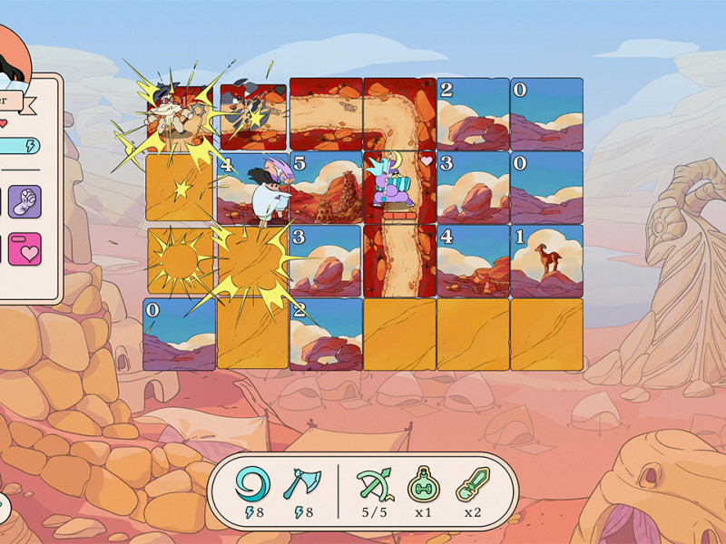 Les PNJ agissent comme des marchands et, comme ce que nous avons vu lors du récent South Park Snow Day, ils nous permettent de sélectionner un ou plusieurs bonus qui apparaissent de manière totalement aléatoire. Selon le PNJ, ses objets peuvent concerner des bonus passifs à nos statistiques (comme une augmentation de l'énergie vitale), une amélioration de la compétence de combat, un nouvel objet consommable, etc. Autant d'éléments que, en bon roguelite , nous réinitialiserons en cas de game over (en perdant également toutes les pièces obtenues). Chaque héros, en effet, possède des capacités différentes qui nécessitent cependant une certaine quantité d'énergie pour être utilisées. Cette énergie se recharge grâce aux objets consommables ou en découvrant les différentes boites. Chaque case se découvre en passant dessus et les cases environnantes sont automatiquement révélées et elles seront toutes numérotées, suivant la structure du champ de mines. Ici, au lieu de mines (toujours présentes sous forme de pièges et de citations), les ennemis se cachent . C’est pourquoi il faut bien réfléchir aux coffrets à découvrir. Pour nous aider, nous devons comprendre les suggestions données par les chiffres. Si une case a un chiffre zéro, vous pouvez continuer sans aucun danger, vice versa, un chiffre élevé indique un pourcentage élevé d'ennemis à proximité.