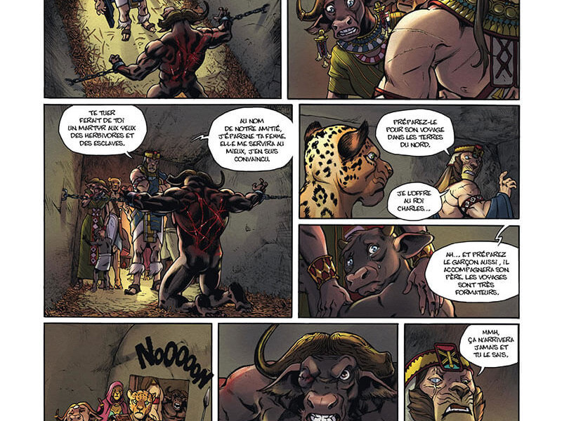 ![]() Plate-forme : Bande Dessinée Date de sortie : 18 Janvier 2023 Editeur : Développeur : Genre : Bande dessinée Multijoueur : Non Jouable via Internet : Non Test par Nic0078/10 Scénario et dessin : Bruno Bessadi Kgosi reprend ses esprits dans la cabane de Logrine qui l'a plongé dans une longue transe afin que le lion perdu retrouve sa mémoire et sa route. Toujours entouré d'Othila, Hind et Wilt, le lion roi déchu se souvient, et ce dont il se rappelle ne le met pas franchement en joie... Le palais, sa tyrannie, l'esclavagisme, son frère. Ses enfant... Mais il faut avancer, Wilt est bientôt rentré chez lui. Deuxième volet de cette fresque animale servie par Bruno Bessaidi, et tout ce que l'on peut en dire, c'est qu'on en prend plein les mirettes ! On retrouve avec bonheur notre troupe ô combien éclectique dans cet opus où Kgosi et Bakham se racontent enfin ! Tout s'explique, les liens se font et parfois se défont, et inextricablement ces quatre là (Kgosi/Bakham comptent pour 1 ou 2 ?) sont liés ! Sur fond de lutte des classe, de tyrannie, d'esclavagisme, de patriarcat, de violence et de rébellion, on prend un pied monstre à avancer dans cette quête de rédemption et de prise de conscience. Les motivations et le passé de chacun ont une vraie épaisseur, un potentiel d'attachement dingue, et Bruno Bessadi s'éclate bien à jouer des contre-pieds forme/fond (l'herbivore sanguinaire, la souris guerrière perchée face aux fauves...) comme à utiliser toutes le ficelles des stéréotypes des récits anthropomorphes pour nous raconter son histoire de monde qui change enfin. Graphiquement parlant, même constat, c'est toujours aussi réussi ! Ambiance Egypte antique qui n'est pas pour déplaire, le dessin est racé, dynamique, vivant et la coloration de Joo fonctionne à merveille, lumineuse à souhait ! Scénaristiquement parlant, on retourne dans le passé, visiter l'histoire de Kgosi, le Roi Lion, mais aussi du démon qui possède son corps, et le tout se met en place brillamment, quelques questions trouvent réponse tout en en soulevant des nouvelles, et le tout s'apprête à exploser dans un épisode final qui s'annonce grandiose ! On parle de réincarnation, de multiples réincarnations même. Pourquoi ? Comment ? Et cette histoire de réincarnation a beau être un pan principal du scénario, ce n'est que dans le tome 2 que l'on connaît les raisons liées à cette réincarnation. Est-ce un problème ? Absolument pas ! Tout est parfaitement amené, l'histoire s'enchaine très bien et on s'attache aux différents personnages que l'on suivra sur la totalité des trois tomes. VERDICT-Ce tome deux de l'Ogre Lion nous nourrit d'infos de belle manière, pose les personnages de façon pérenne et nous ouvre la voie sur un troisième et dernier tome qui promet d'être jouissif ! Un récit pour celles et ceux qui aiment partir à l'aventure et qui sont amateurs du genre anthropomorphique ! |
