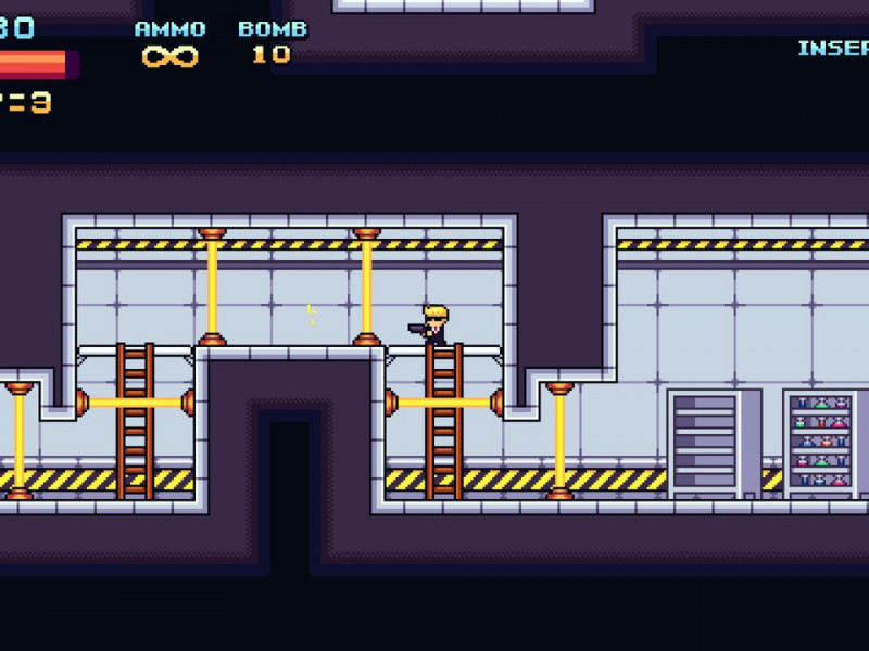 Une mission pour sauver l'humanité : c'est le postulat sur lequel est né et développé Agent Fall, un titre à défilement latéral court mais très dense. Le titre propose des mécaniques de plateforme et de run-and-gun sous une forme très simple mais directe. Commençons par dire que le titre peut être complété en une heure environ : cela signifie évidemment se retrouver face à une intrigue extrêmement simple et avec très peu de développements notables au cours de l'expérience. Nous sommes des agents secrets chargés de sauver le monde d'une menace extraterrestre : ce prétexte sera la rampe de lancement d'une série de niveaux aux décors somme toute variés et intrigants, allant des déserts à la campagne jusqu'à l'intérieur de vaisseaux spatiaux extraterrestres. En substance, donc, le titre présente, surtout pour la quantité de contenu proposé, une excellente variété et qualité de celui-ci , tout en restant dans sa simplicité : en effet, il ne manque pas de courtes cinématiques et de dialogues avec d'autres personnages, extrêmement simples dans leur caractérisation. L'expérience de jeu se résume à une série de quelques commandes simples : se déplacer, sauter, tirer et lancer des grenades . Notre agent secret peut tirer aussi bien devant lui qu'au dessus de lui (mais il ne peut pas effectuer d'attaques obliques, un gros défaut à notre avis) pour vaincre les ennemis, qui dans la plupart des cas tomberont après le premier tir. Notre personnage est également équipé d'une barre de vie, une série de vies qu'il ne faut pas consommer pour éviter de tomber en game over et d'une réserve de balles et de grenades, qu'il faut donc utiliser avec parcimonie. Les ennemis présents au cours de l'aventure, bien que comme on le rappelle particulièrement courts, sont assez variés : adaptés à chaque fois à l'environnement de référence, on passe des militaires aux extraterrestres, tous deux conçus de manière simple mais résolument intuitive.