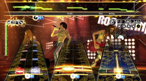 Editeur : Développeur : Genre : Pop Multijoueur : Oui Jouable via Internet : Non Test par Nic0077.5/10 Après des mois d'attente, Rock Band sort enfin sur Wii en Europe. Rock Band reprend un principe proche de Guitar Hero ... pour ce qui est de la guitare. Rien de plus normal, puisque nous retrouvons à la tête du projet le studio Harmonix, qui avait réalisé les 2 premiers volets de la série (+ le dérivé GH 80 sur PS2). Mais Rock Band va plus loin puisqu'il est également possible de jouer de la batterie et de même de chanter. Le gameplay se veut lui assez grand public : Avec la guitare, le principe se veut proche de Dance Dance Revolution, dans le sens où des touches apparaissent à l'écran et vous devez effectuer le plus rapidement et avec la bonne rythmique, le morceau qui défile. Et comme ce titre embarque un mode quatre joueurs, il sera meme possible de jouer de la basse. Le jeu reste donc proche de ce point de vue de là de Guitar Hero et comprend la plupart des modes classiques (carrière, carrière coop, partie rapide, multijoueur). VERDICT-