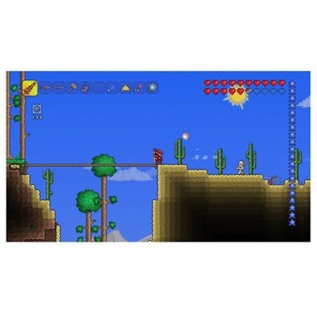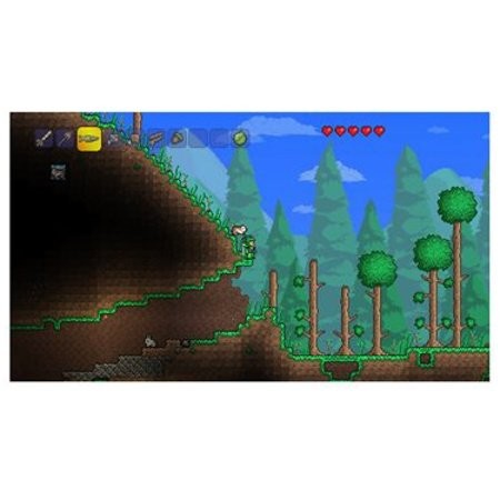 Lancé en mai 2011 sur PC, Terraria a déjà connu une grande vague d'adaptation sur consoles. Sur Nintendo 3DS, c'est à nouveau le studio Engine Software qui est responsable du portage. Proposée à 19,99€ sur l'eShop (la version cartouche arrive en janvier), cette version nous permet de visiter des environnements générés aléatoirement par l'ordinateur. Dans l'aire de jeu, vous devrez creuser toujours plus loin pour collecter de nombreuses ressources (accessoires, argent, minerais), survivre à des événements divers et variés (chute de météores, arrivée du Père Noël), explorer un monde toujours plus grand, et construire des centaines d'objets (des armes pour se défendre, mais aussi une maison et pourquoi pas un château). Les bâtiments accueilleront rapidement de nombreux gens qui vendront leurs services pour vous aider dans votre voyage (marchand, infirmière, etc). Les monstres sont incroyablement variés (150 au total), et il n'est pas rare de tomber sur un boss (15 ). Heureusement, l'arsenal de départ comporte des haches de combat, une épée, un arc, des shurikens, des fusils ou encore des boomerangs, et de nombreux bonus apporteront des pouvoirs supplémentaires à votre personnage (notamment le double saut).