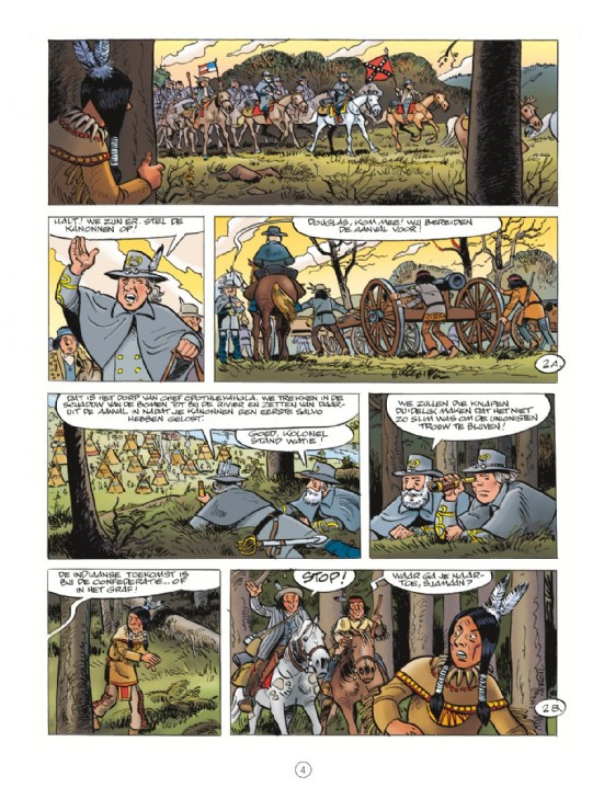 Suite au décès du scénariste Raoul Cauvin, c'est l'auteur de bande dessinée Kris (alias Christophe Goret) qui a repris la plume de cette série classique de longue haleine. Il a fait ses débuts dans l'album précédent et en a tiré une grande satisfaction. Nous avons également pris beaucoup de plaisir à lire ce deuxième album. Rien n'est innovant, mais nous ne sommes pas près de débrancher Les Tuniques Bleues, les histoires nous ont déjà procuré trop de plaisir de lecture pour cela. Et que dire du dessinateur Willy Lambil, aujourd'hui âgé de 87 ans ? Combien de dessinateurs l'imitent ? Livrer un nouvel album chaque année pendant des décennies ? La qualité de ses dessins diminue. On le remarque surtout dans les visages des personnages et souvent dans les mains. Mais le fait que l'homme sache encore ce qu'est le dessin est perceptible dans les grandes planches et les dessins d'ensemble de camps et de forts. Sa prédilection pour la faune locale est à nouveau présente. Hiboux, canards, ratons laveurs, écureuils, poissons (chat), biches et chevaux... beaucoup de chevaux passent à nouveau. Il n'est pas encore question d'abandonner. Depuis deux ans, il forme un nouveau tandem avec Kris. Espérons que ce tandem continuera encore quelques années.