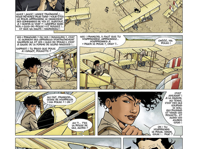 Black Squaw est le surnom donné à Bessie Coleman dans cette histoire. Bessie est née au Texas avec des racines mi-indiennes, mi-afro-américaines. Dans le premier volume, elle se heurte au Ku Klux Klan (KKK), qui veut bannir les Noirs de son pays. Elle tue deux de leurs membres, et le KKK organise une chasse à l'homme pour arrêter Bessie. Dans l'album précédent, Bessie parvient à s'accrocher à la voiture des membres du KKK après plusieurs événements. Cet album commence lorsque Bessie gît inconsciente dans la boue parmi les cochons. Grâce à des flashbacks - sous la forme de ses rêves - nous pouvons voir une partie de sa jeunesse et de sa formation de pilote à l'école Caudron du Cotroy en France. Lorsqu'elle se réveille à nouveau, on lui dit que les membres du KKK se cachent dans la forteresse du dragon. Elle n'hésite pas un instant et part avec son arme pour se venger. Si seulement ça se terminait bien, car elle ne sait pas qu'il n'y a plus de balles dans son arme. Une chose est sûre : le thème est toujours d'actualité. Le fait que l'histoire soit basée sur des faits réels (Bessie Coleman a réellement existé et a été l'une des premières femmes pilotes américaines) lui donne une dimension supplémentaire. Il montre, entre autres, qu'il faut toujours poursuivre ses rêves. Mais trêve de philosophie, le scénariste Yann (Thorgal, XIII Mystery, Angel Wings,...) s'est clairement bien documenté et ajoute de jolis éléments de fiction qui pimentent l'histoire. À l'époque, par exemple, les mafiosi et le Ku Klux Klan étaient des sujets brûlants. Ces éléments apportent la tension et la variété nécessaires à l'histoire. Nous avons l'occasion de voir différents types d'avions, ce qui n'est qu'un surplus dans cette série. Surtout quand le dessinateur Alain Henriet (Berentand, Damoclès, Golden Cup,...) s'y met, c'est un régal pour les yeux. Les émotions sur les visages retiennent autant l'attention que les impressionnantes scènes d'avion. C'est très astucieux. L'histoire se déroule au début des années folles, qui sont dépeintes de manière très attrayante, grâce aux couleurs d'Usagi. Pour finir, vous avez droit à un dossier d'accompagnement dans cet album, ce qui est un joli supplément. Dans une sorte de roman, Alain Henriet écrit son compte-rendu d'une visite en Picardie sur les traces de Bessie Coleman (la vraie). Ses propres photos et les photos de l'ancienne boîte mettent en valeur l'ensemble. Il est écrit d'une manière amusante et constitue en tout cas une valeur ajoutée. Il reste encore un album dans ce projet en quatre parties, et un nouveau cycle de "Dent d'Ours" par le tandem Yann-Henriet est en préparation.