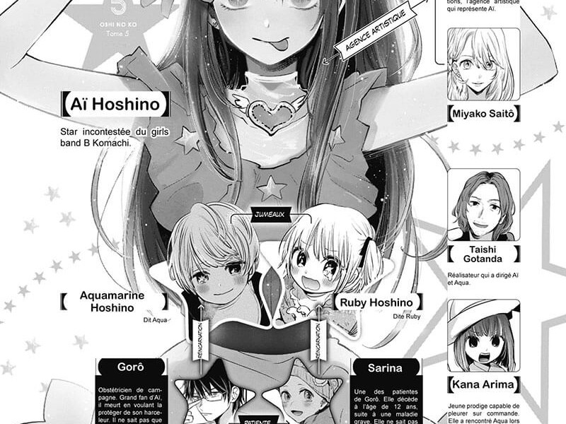 Oshi no Ko est une série toujours en cours de parution au Japon et qui a connu sept tomes à ce jour aux éditions Shueisha. L'histoire commence avec une belle fille, son sourire parfaitement faux et les gens qui l'aiment égoïstement pour cela. Que se passe-t-il dans les coulisses de l'industrie scintillante du showbiz ? Jusqu'où iriez-vous pour le bien de votre idole bien-aimée ? Que feriez-vous si vous découvriez que la réincarnation est réelle ? La vedette du spectacle est Aquamarine Hoshino et la scène n'est qu'une façade. Parviendra-t-il à atteindre le point culminant avant que le monde du glamour ne l'avale tout entier ?