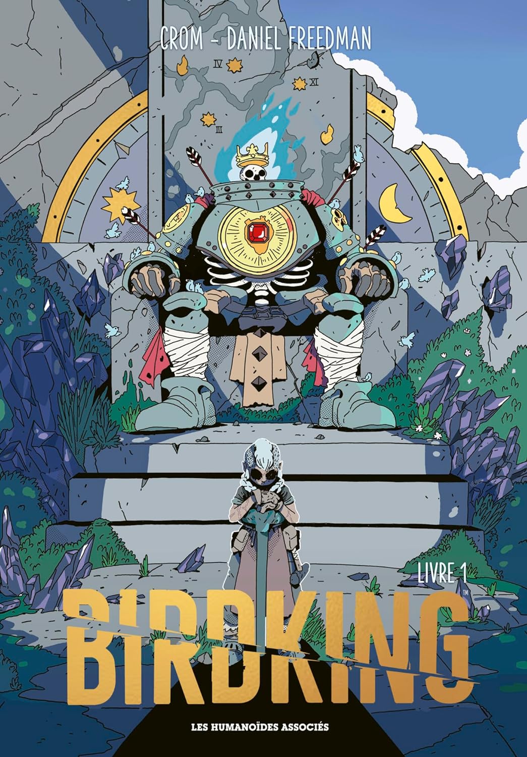 Birdking propose un paysage sombre composé d'enveloppes anciennes civilisations et de vestiges de palais d'une époque oubliée depuis longtemps. L’époque actuelle est celle de la guerre, avec un despote monstrueux retenant vaillamment des forces (potentiellement) héroïques. Dans ce monde effrayant, nous trouvons Bianca, une apprentie forgeron qui vit avec son maître dans un royaume soumis par un mystérieux seigneur de guerre. Les choses tournent mal lorsqu'elle gêne certains soldats, et le forgeron et son apprentie entreprennent un voyage pour se mettre en sécurité. Apparemment, son mentor est le dernier d'une certaine secte de forgerons capables de travailler avec des armes magiques, ce qui lui donne quelques petites libertés dans une culture constamment en guerre. Et bien sur, Bianca exerce également ces pouvoirs, ce qui en fait une personne très recherchée. Heureusement, elle a réveillé un pouvoir ancien qui peut l'aider à assurer sa sécurité. Ce livre est essentiellement le Vol. 1 d'une saga en plusieurs parties, il passe donc un temps décent à construire le monde et à préparer l'histoire dans son ensemble. Ce tome présente habilement les forces en présence, les personnages et la quête, qui consiste essentiellement pour Bianca à s'éloigner du roi fou et maléfique. C'est une aventure fantastique unique qui implique une histoire qui va au-delà du scénario immédiat. Les personnages sont attachants et chaleureux, leur monde est diversifié et vaste. C'est une lecture tout à fait engageante, bien améliorée par l'art charismatique de Crom. Les illustrations sont vraiment belles, avec des lignes épurées et des couleurs vives et plates partout. Le style artistique est facilement comparable à celui d'Andrew MacLean ou de Mike Mignola, et il s'accorde bien avec la fantaisie du monde de Birdking. C'est comme si Headlopper rencontrait Hellboy de la bonne manière. La coloration est parfaite pour le dessin au trait. Ce volume de Dark Horse comprend également des documents remplis de conceptions de personnages, de vignettes et de scripts.