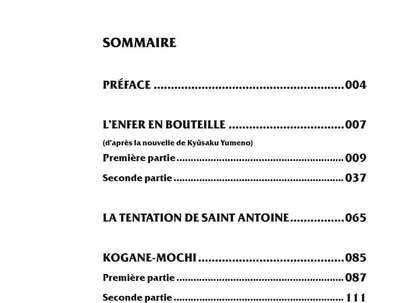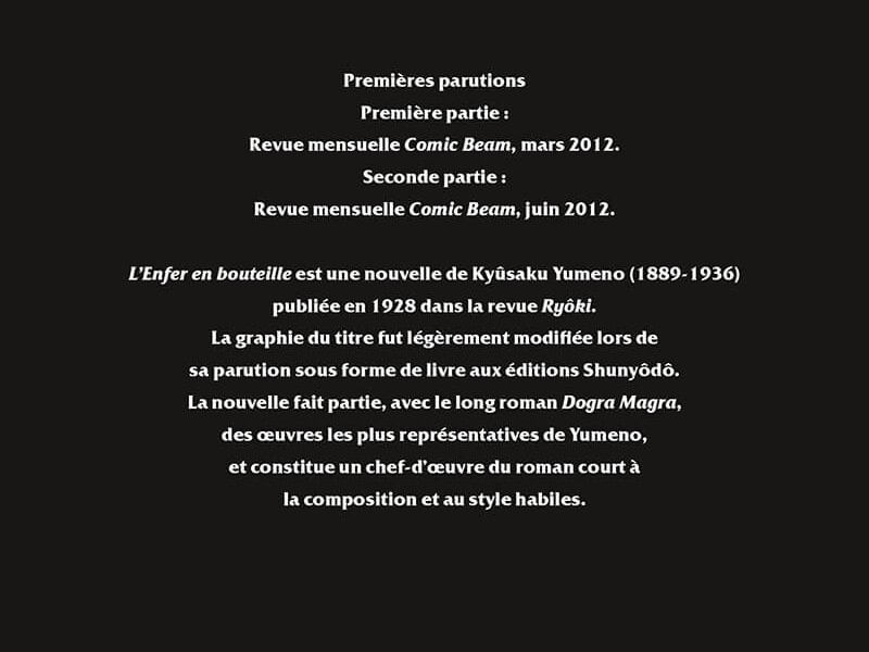 L'enfer en bouteille (Binzume no Jigoku) est un manga unitaire publiée au Japon aux éditions Enterbrain. Il s'agit d'un recueil de quatre nouvelles adaptées par le mangaka, maître du genre érotico-grotesque, Maruo Suehiro. "L'enfer en bouteille" est la première histoire que nous rencontrons dans ce volume et est une adaptation, sous forme de manga, de la nouvelle du même nom de Yumeno Kyusaku, publiée pour la première fois en 1928 dans le magazine Ryoki, et considérée comme l'une de ses meilleures histoires. C'est l'histoire de deux frères et sœurs, un garçon et une fille, qui, à la suite d'un naufrage, se retrouvent sur une île déserte. Contrairement à ce que l'on pourrait penser, les deux personnages parviennent à en faire une oasis de bonheur et à vivre en harmonie l'un avec l'autre et avec la nature. Jusqu'à ce qu'ils commencent à grandir et que le "diable", le péché, commence à s'insinuer parmi eux, marquant inexorablement leur destin. "La tentation de Saint Antoine" est la deuxième histoire que nous rencontrons dans ce manga, inspirée de La vie de saint Antoine, une œuvre écrite par l'évêque Athanase d'Alexandrie au IVe siècle. Dans cette version de Maruo Suehiro, c'est un moine qui est mis à l'épreuve par les tentations de la vie charnelle et terrestre. Il s'agit d'une courte histoire qui montre la force d'âme dont doit faire preuve un moine pour surmonter les tentations de son sexe. "Kogane-Mochi" est la troisième histoire du livre et est le titre d'une célèbre œuvre de raguko, un genre théâtral japonais, dans lequel un acteur récite un monologue comique, appartenant au genre plus large des histoires sentimentales. L'histoire originale a été écrite par San'yutei Enchô et raconte l'histoire d'un homme obsédé par l'argent. Maruo Suehiro parvient, par ses dessins et son adaptation, à recréer l'humour noir déjà présent dans l'histoire originale. L'obsession du dieu de l'argent pousse le protagoniste et les autres personnages de l'histoire à accomplir des actes vraiment impitoyables. Enfin, "Pauvre soeur" est la dernière histoire que nous trouvons dans le manga et raconte le sacrifice d'une sœur aînée qui, en se prostituant, tente de garder libre son jeune frère, qui souffre d'un syndrome particulier, et de le sauver d'un père qui veut le vendre à la foire aux monstres.